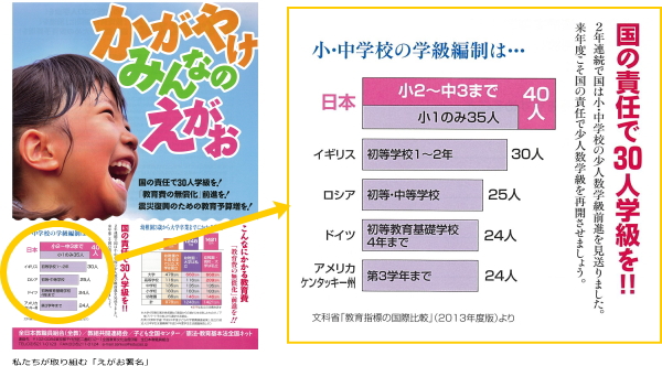 この説明の中で、教員一人当たりの児童・生徒数が将来にはOECD平均並みまで減少するという資料が用いられています。欧米の各国の人数も合わせて出されていますが、一方で全教が進める「えがお署名」には同じような国々の少人数学級の状況が出されています。