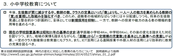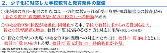 一方、経済財政諮問会議では西川副大臣は「2020年教育再生を通じた日本再生の実現に向けて」の中で、一定の教員の「数」は質の向上とともに必要だと反論しています。