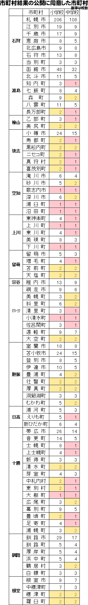 各教育局管内ごとに、多少のばらつきがありますが、市町村に小中1校ずつの学校でも、市町村別結果の公表に踏み切っている場合があることがわかります。