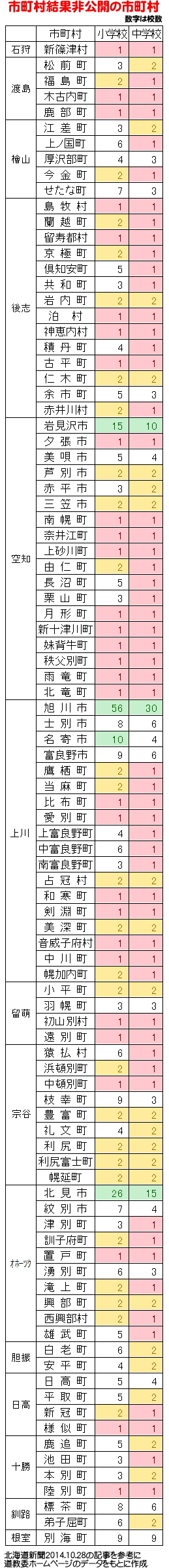 道新報道によると、旭川・岩見沢は「道教委による一律の公表は序列化につながりかねない」としているとされ、学力・学習状況調査の点数至上主義に惑わされず、街の学校数に関わらなく、教育的な視点から判断をした市町村が、規模の大小を問わず多くあることに気付かされます。