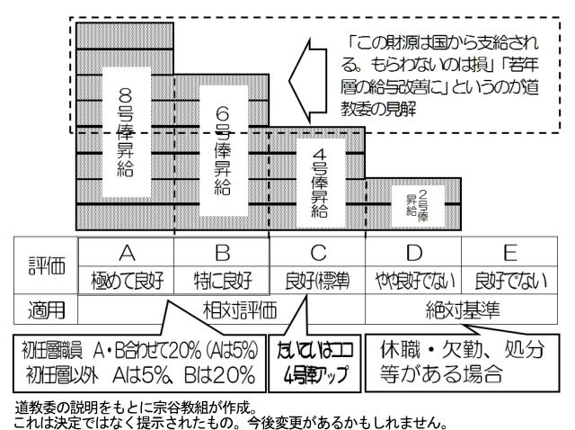 査定昇給には財源が必要です。それは、A・B区分に当たる見かけ上「余計に払う部分」です。道教委はこの説明に「査定昇給で増額する給与部分(A・B)は国から支給されるもの。道財政には関係しない。現在は国からもらわない分給与水準は下がっている」「(昔々あった昇給短縮を引き合いに)中堅層以下は、昇給短縮の恩恵を受けていなく格差がある。だから給与改善のために査定昇給は必要だ」と説明しています。
